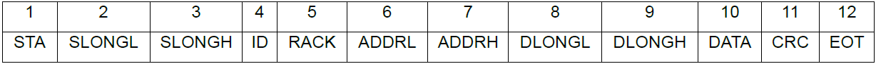 SLONGL、SLONGH:SLONGH其后指令字節數,從STA開始,以十六進制雙字節表示,低字節在前,高字節在后。如果其后字節數為8個,則SLONGL SLONGH寫入:08 00,如果其后字節數為20個,則SLONGL SLONGH寫入:14 00。