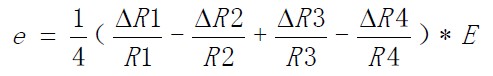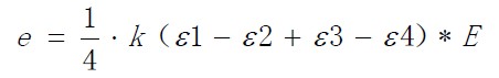 若四枚應變片完全相同,比例常數(shù)為K,且應變分別為ε1 、ε2 、ε3 、ε4,則上式可寫成下面的形式: